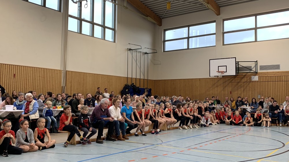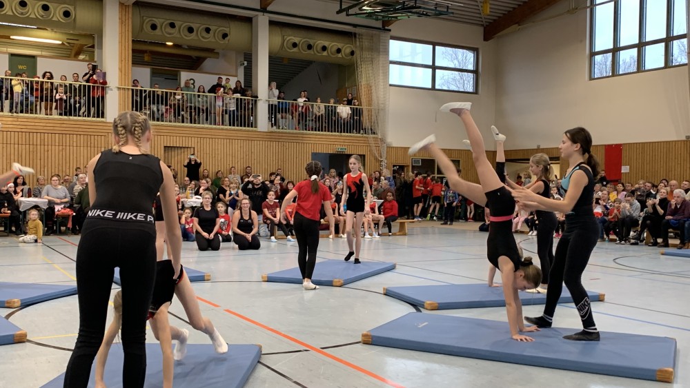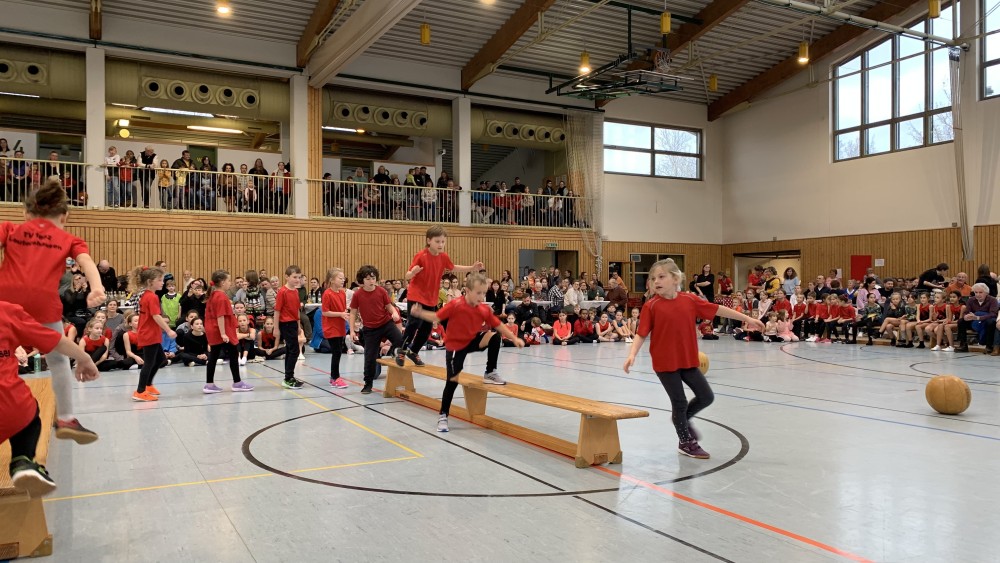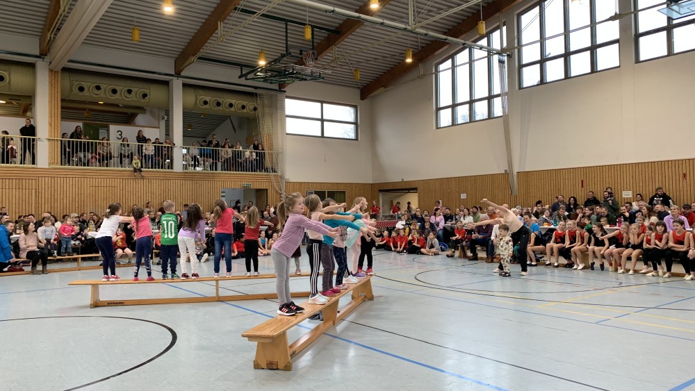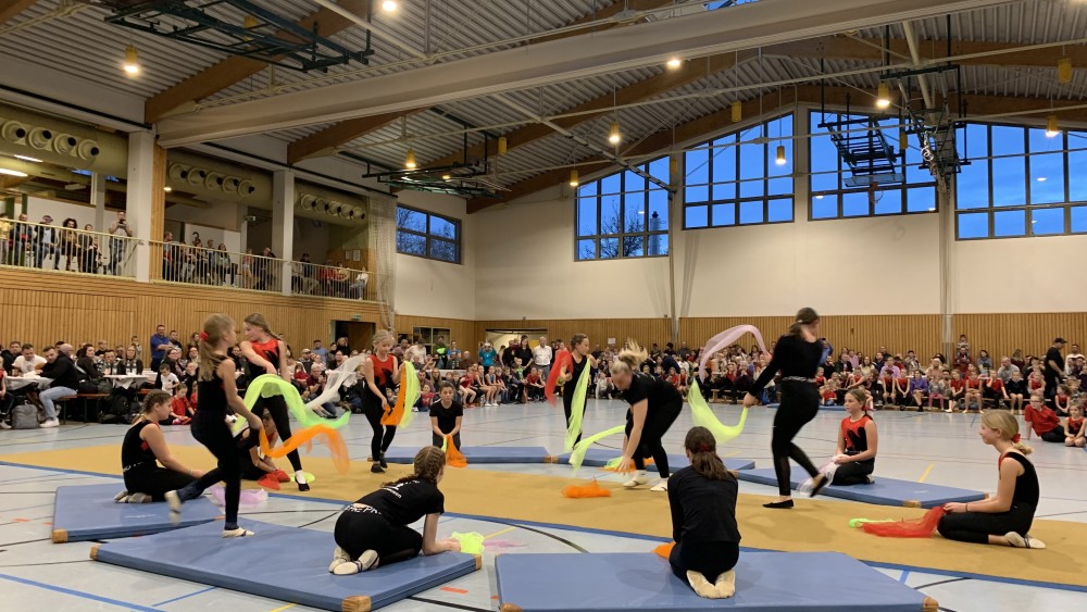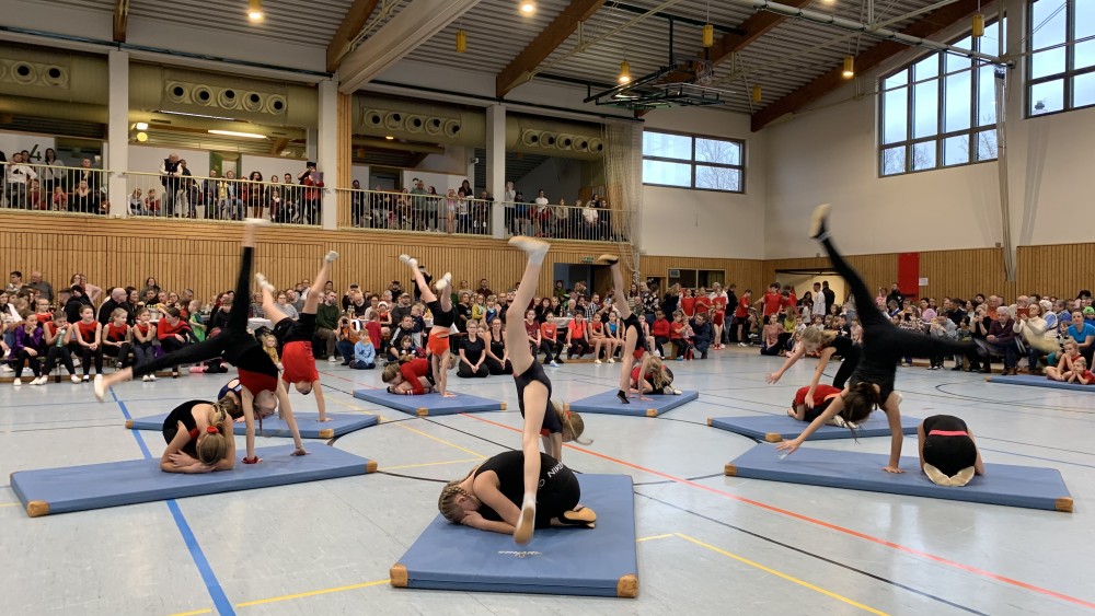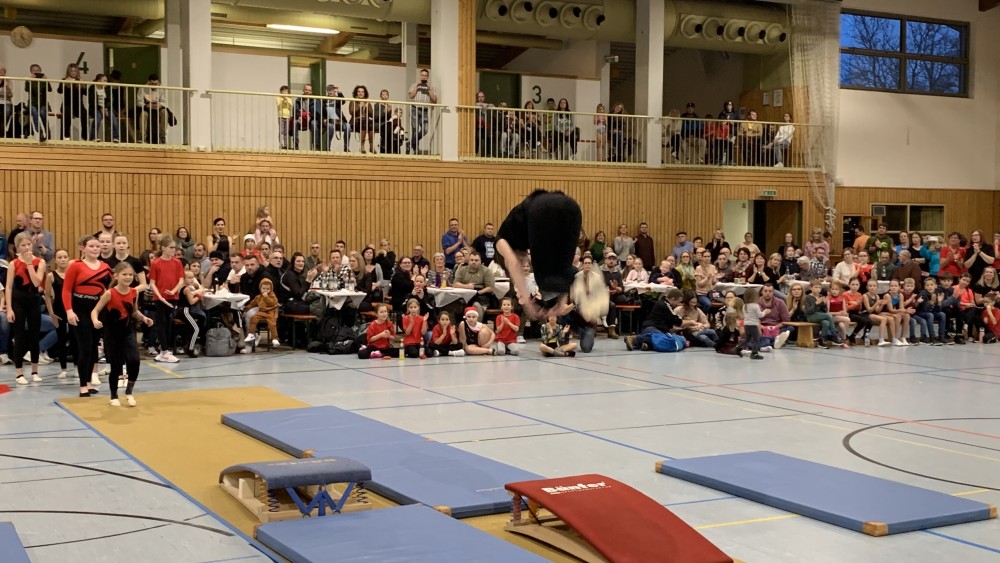 Abwechselnd folgten nun Darbietungen der Kinder- und Jugendlichen der Turnabteilung und der Leichtathleten. Schwungvoll mit fetziger Musik ging es um und auf die Bänke und die Turnerinnen steigerten bei jedem Auftritt ihre Schwierigkeiten. Unter großem Applaus flogen sie mit Flic-Flac und Salto über die das Trampolin und die Matten.