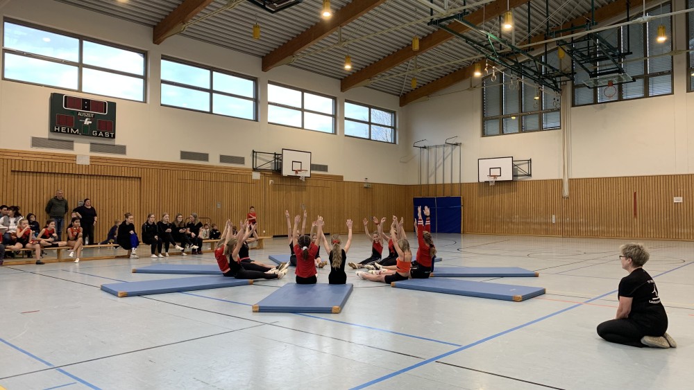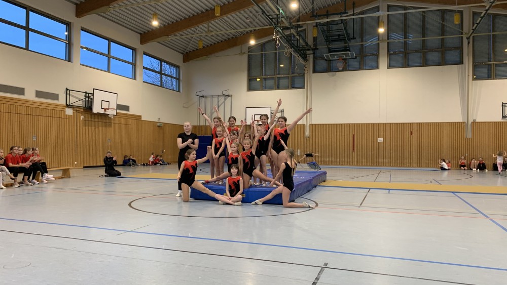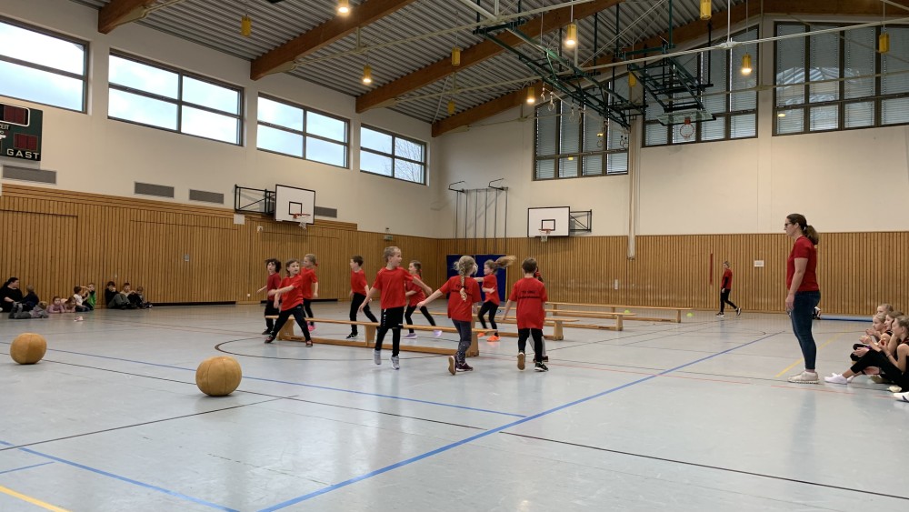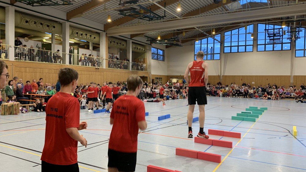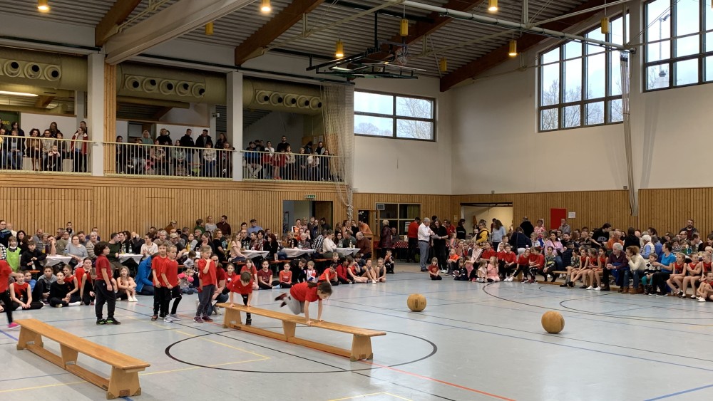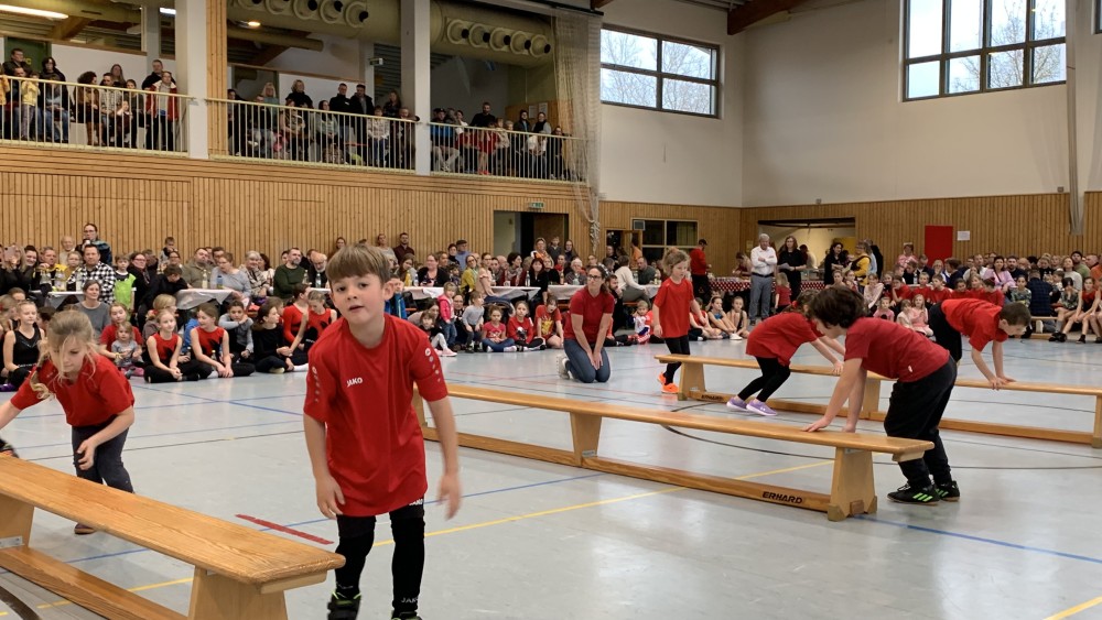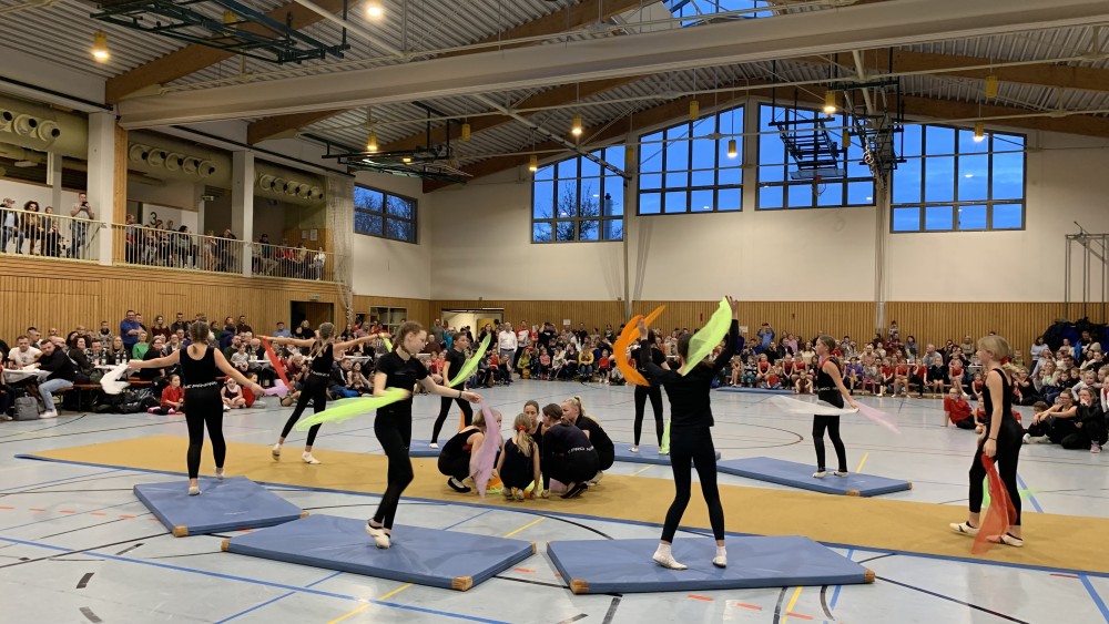 Abwechselnd folgten nun Darbietungen der Kinder- und Jugendlichen der Turnabteilung und der Leichtathleten. Schwungvoll mit fetziger Musik ging es um und auf die Bänke und die Turnerinnen steigerten bei jedem Auftritt ihre Schwierigkeiten. Unter großem Applaus flogen sie mit Flic-Flac und Salto über die das Trampolin und die Matten.